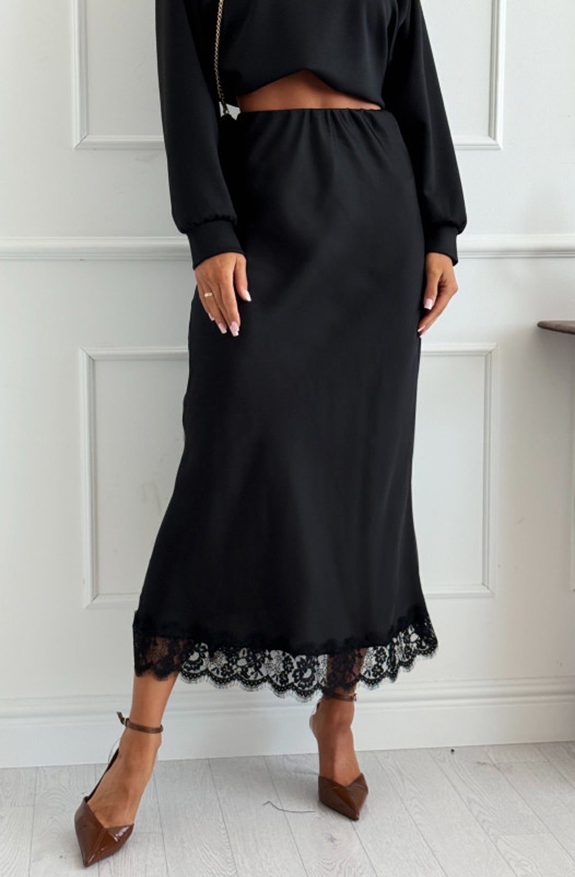 Zabrina Satin Lace Trim Midi Skirt-Black