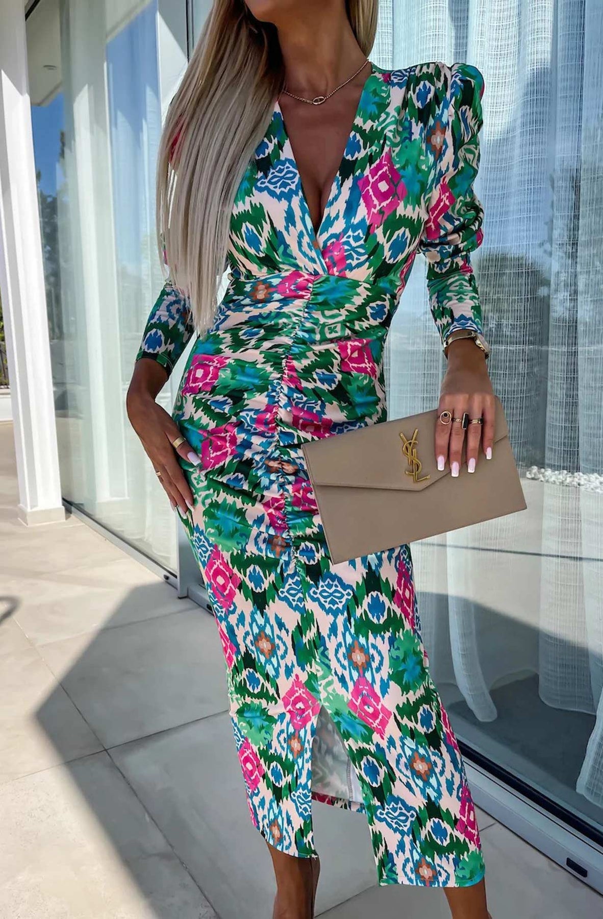 Lucy Abstract Print Bodycon Ruched Midaxi Dress-Green