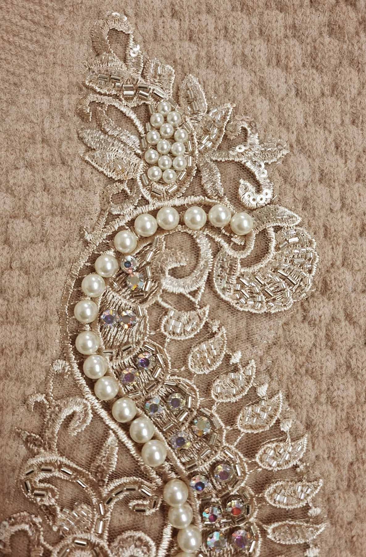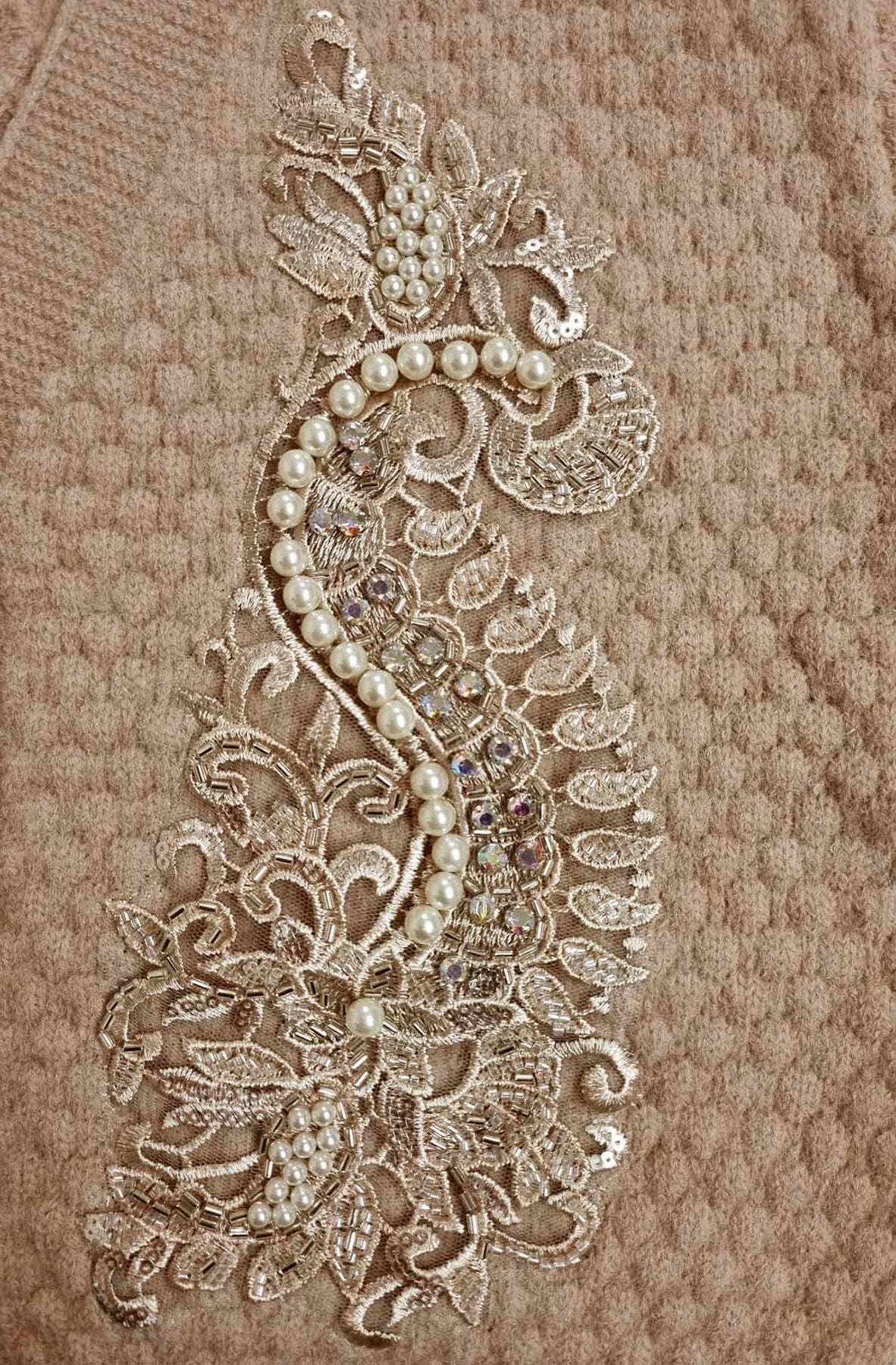 The front is elevated with paisley embroidery, hand-applied pearls & sequins, and finished with delicate lace appliqué 🌸💎 – giving the knit a romantic, festive glow.