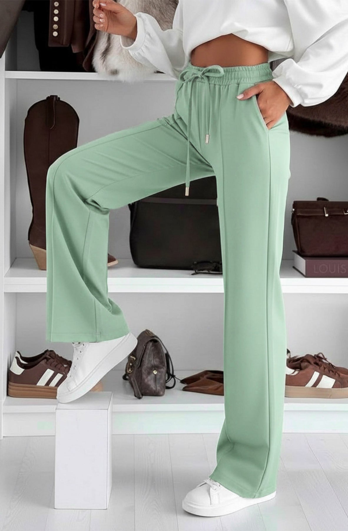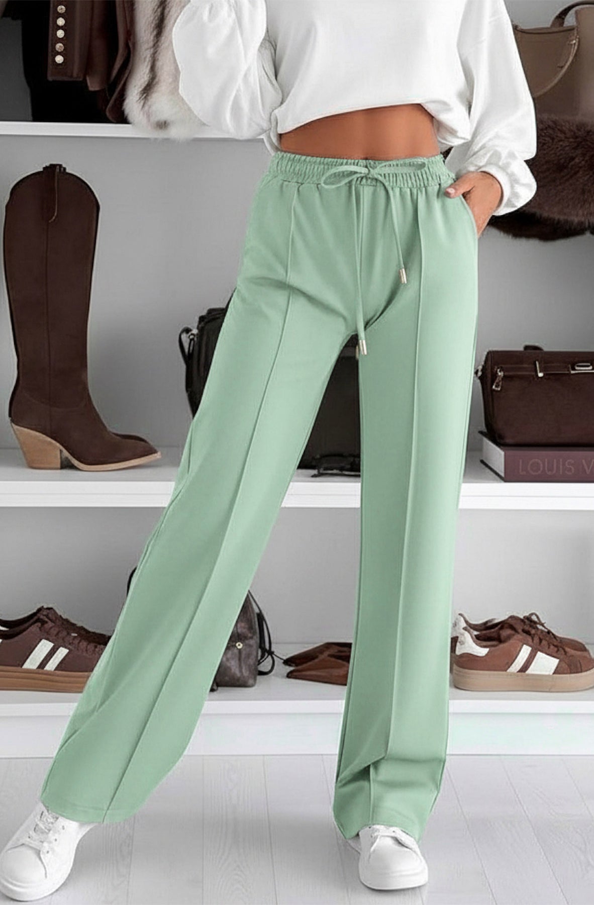 Crafted from a soft, stretchy fabric blend, Sarah features an elasticated waistband with adjustable drawstring for all-day comfort, plus practical side pockets for added functionality ๐Ÿ‘–๐Ÿค. Subtle vertical seam detailing along the legs creates a sleek, elongating effect while keeping the look minimal and refined.