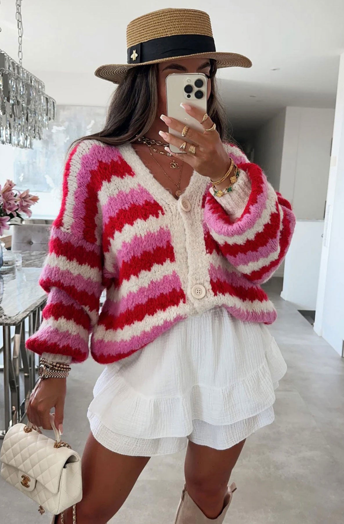 Tamara Contrast Patterned Knitted Cardigan-Red